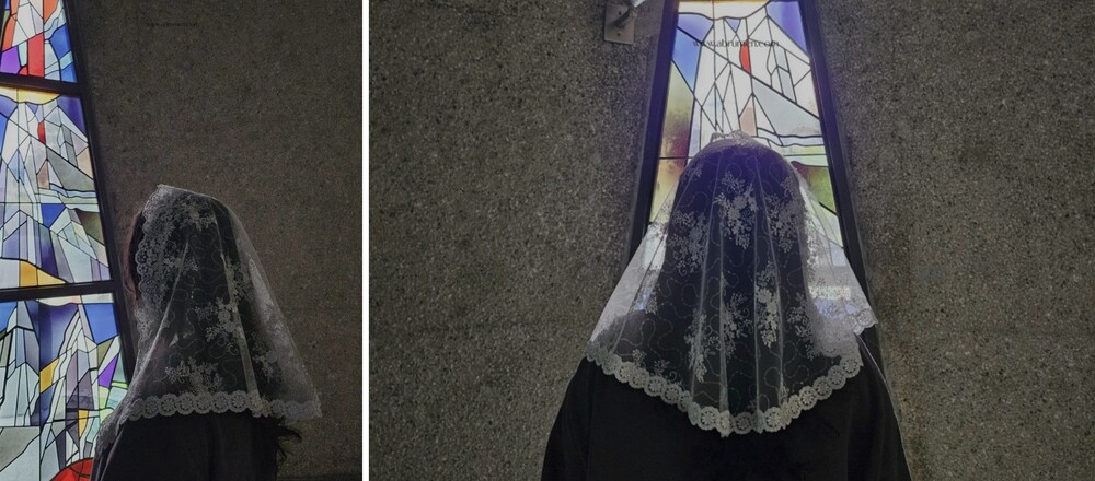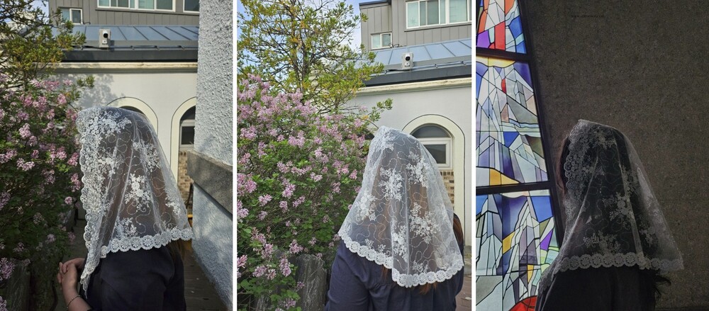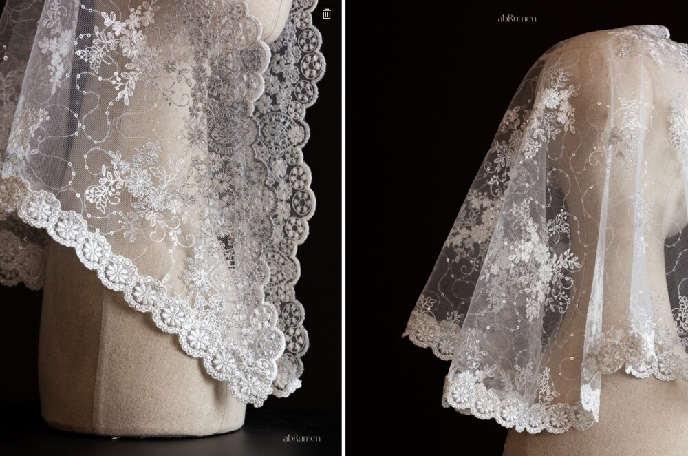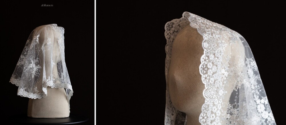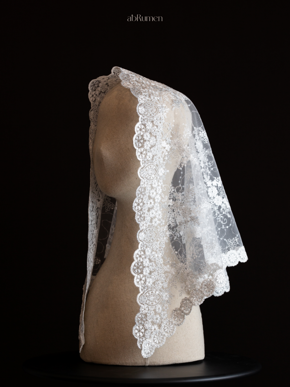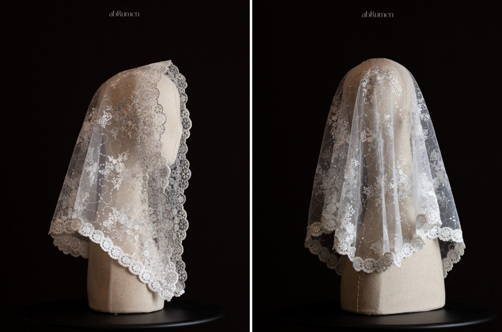 abRumen의 미사보는 단정하고 우아한 분위기로 혼배미사의 순간에도 잘 어울립니다.
