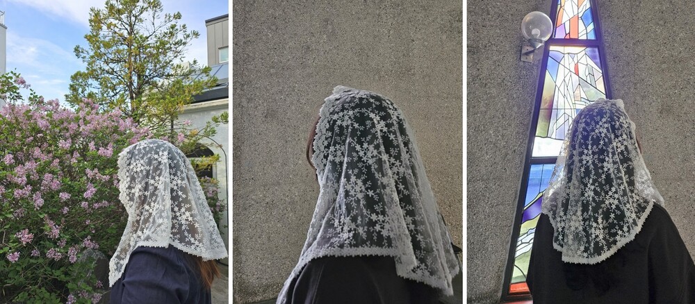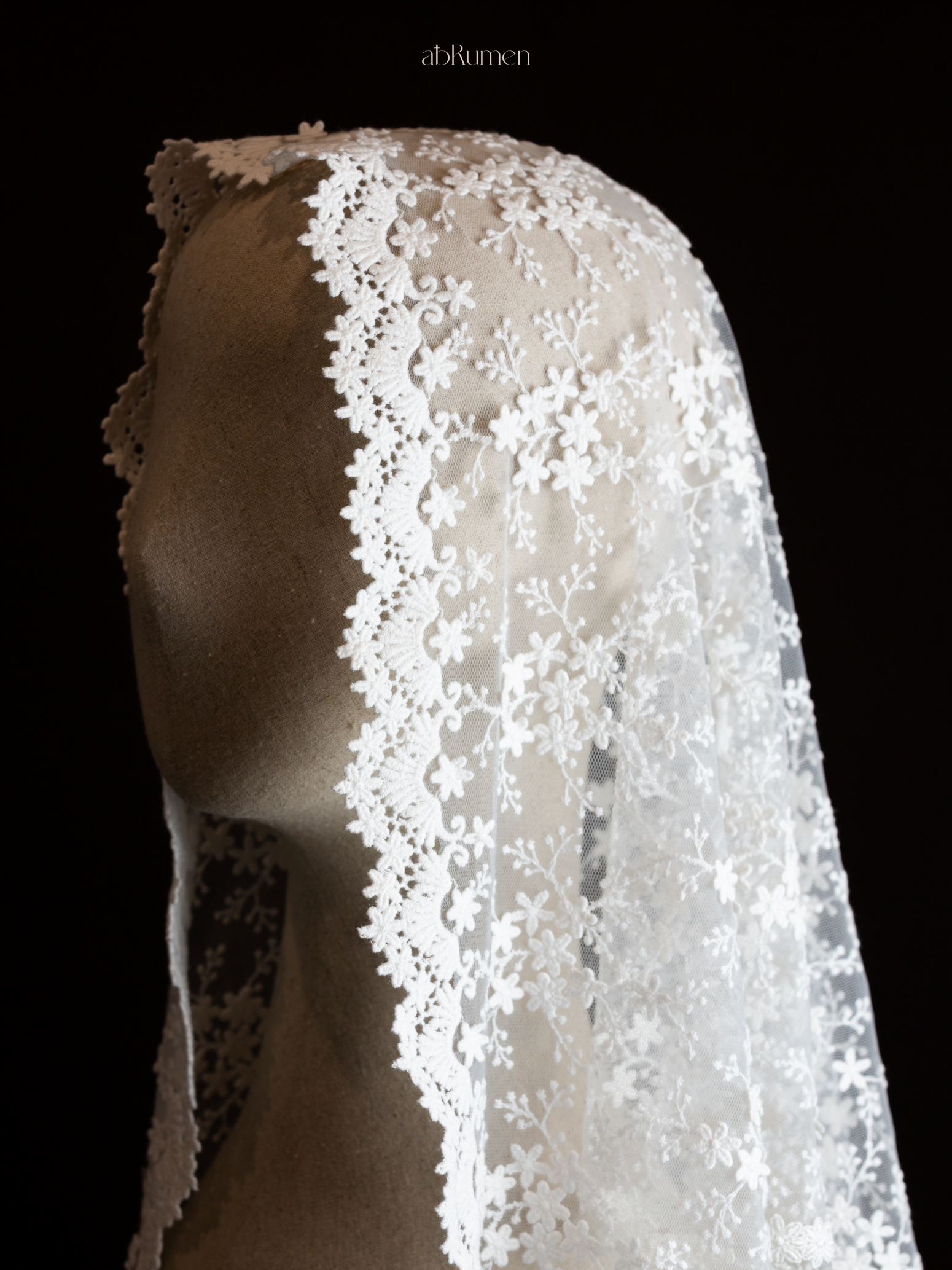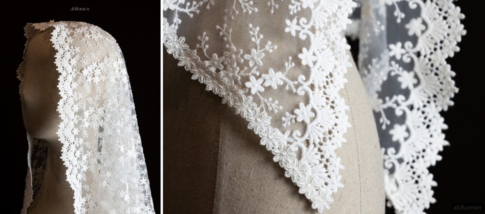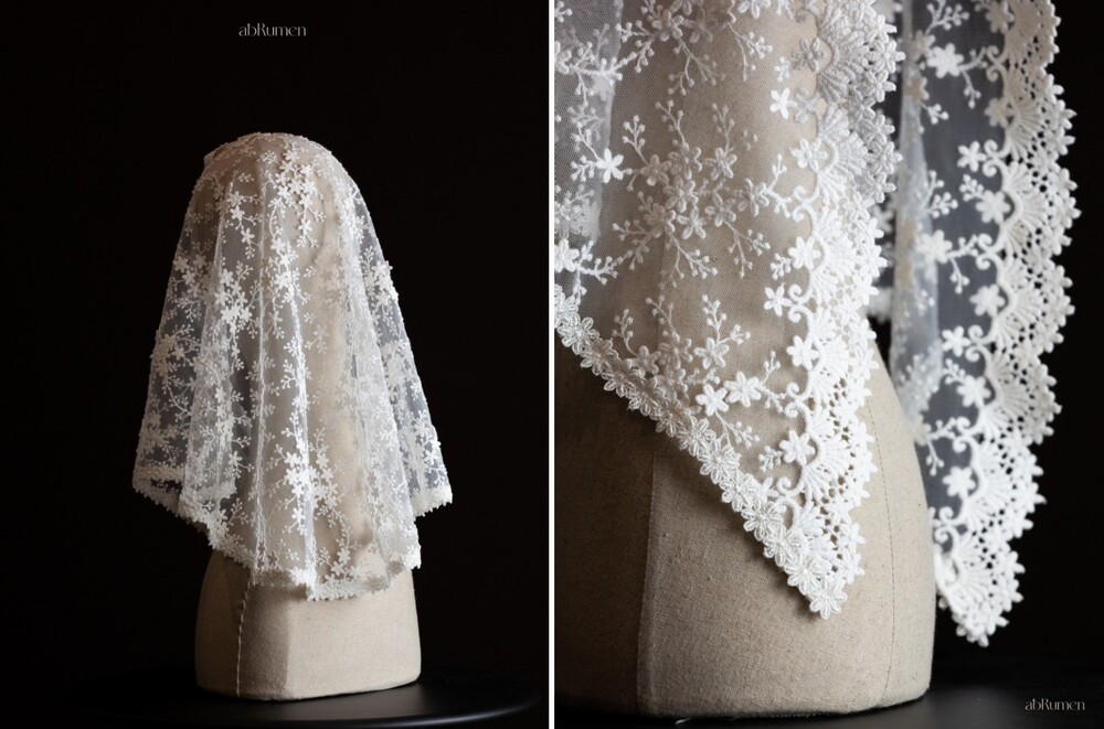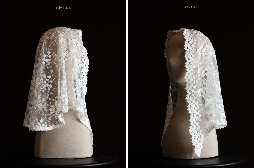 abRumen의 미사보는 단정하고 우아한 분위기로 혼배미사의 순간에도 잘 어울립니다.