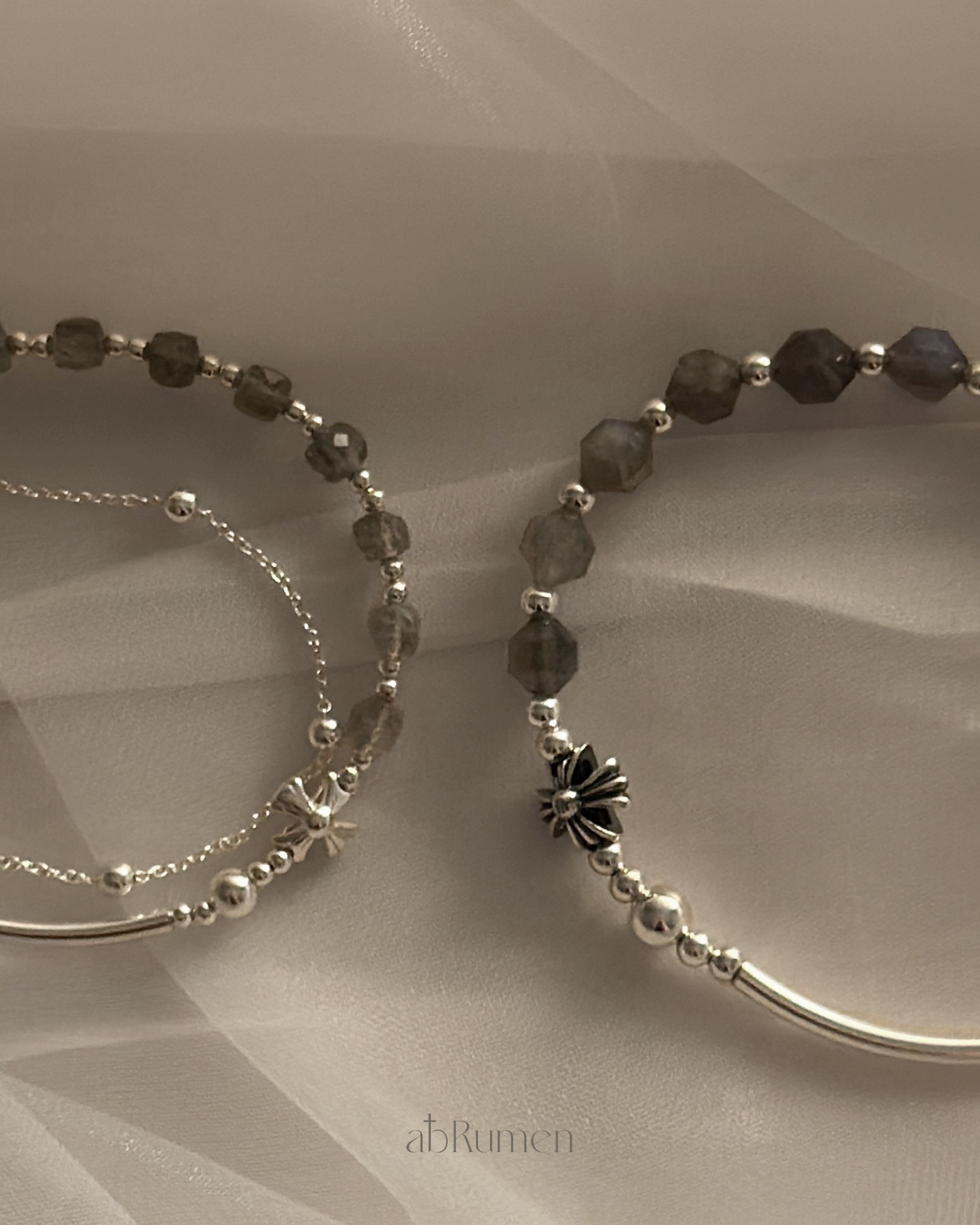 섬세하게 겹쳐진 체인과 그레이 톤의 래브라도라이트가가볍고 우아한 무드를 완성합니다.
