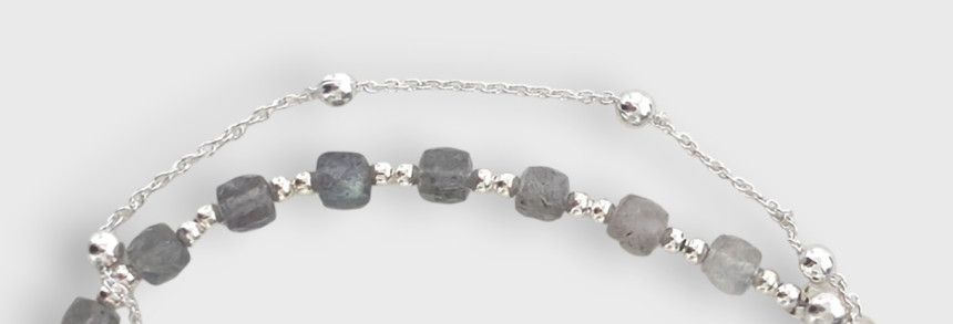 "은은한 회색빛의 래브라도라이트 원석과 실버 체인 레이어드, 크로스 포인트로 완성된 묵주 팔찌"