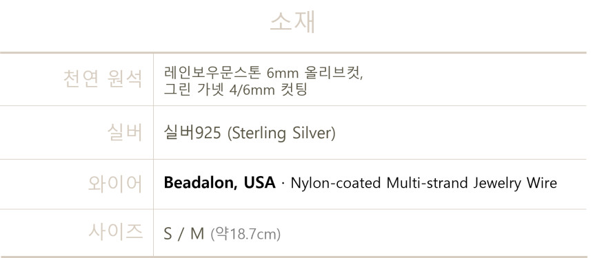 올리브 톤의 그린가넷과 실버 925가 만나 손목 위에 은은한 포인트를 더합니다.
