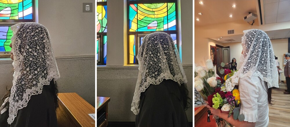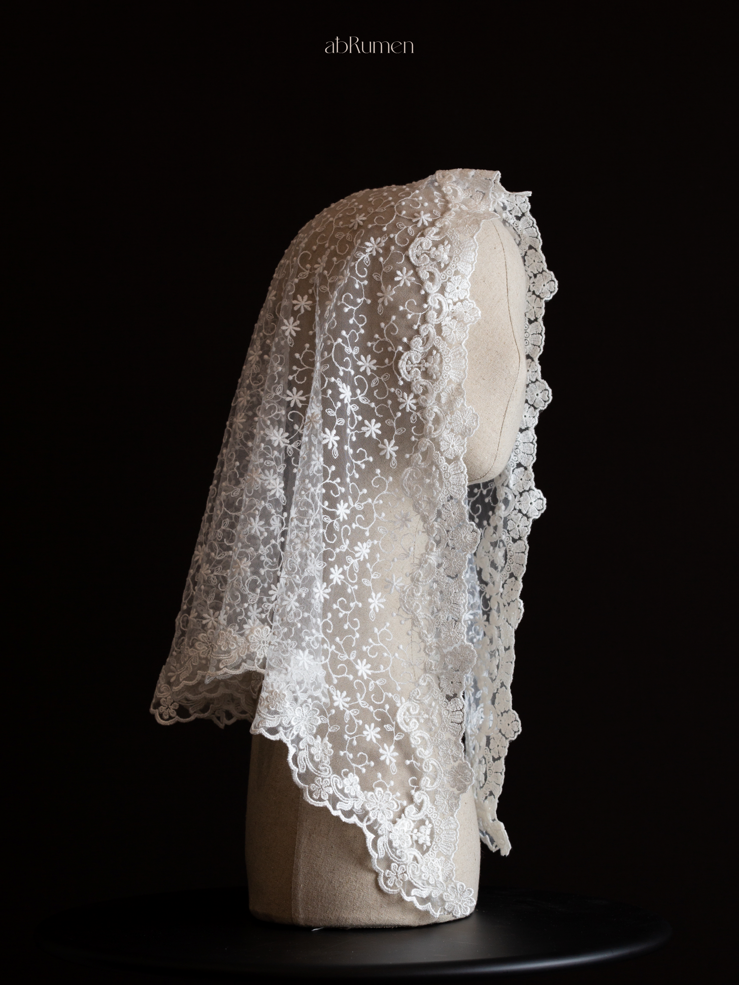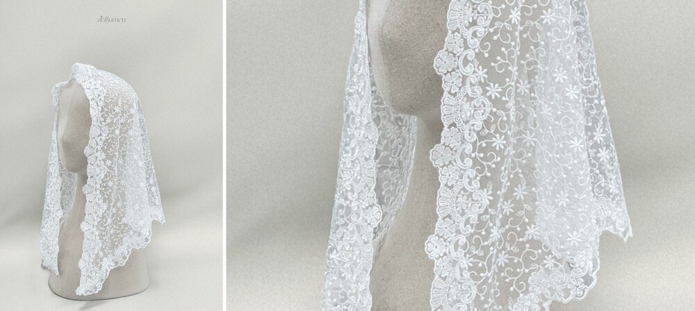 abRumen의 미사보는 단정하고 우아한 분위기로 혼배미사의 순간에도 잘 어울립니다.
