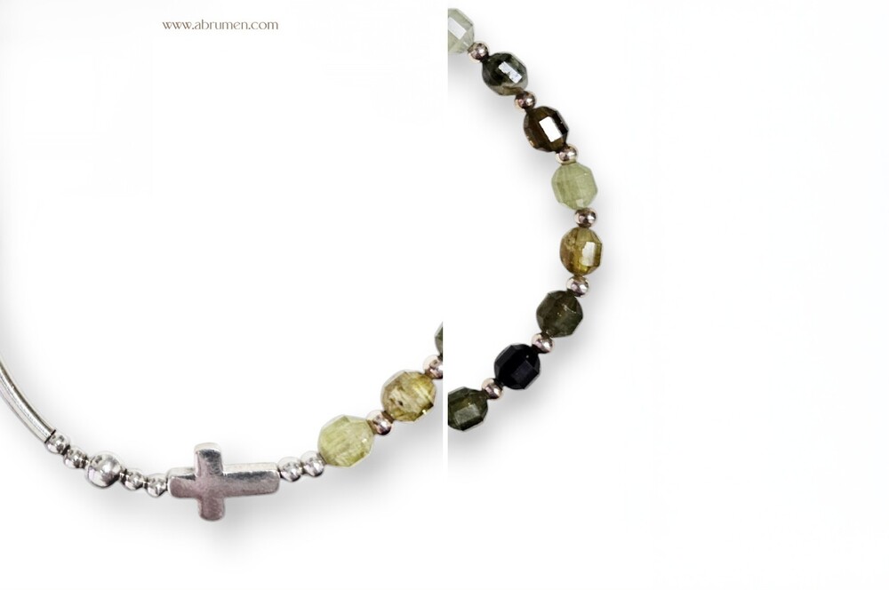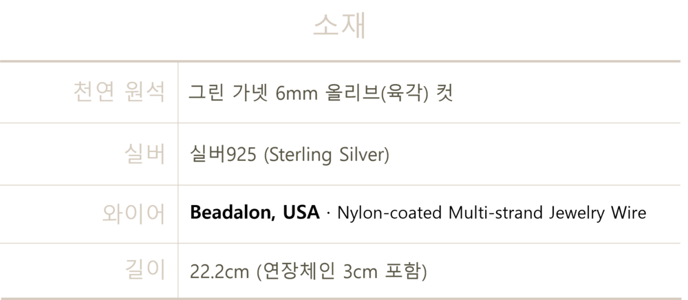 올리브 톤의 그린가넷과 실버 925가 만나 손목 위에 은은한 포인트를 더합니다.