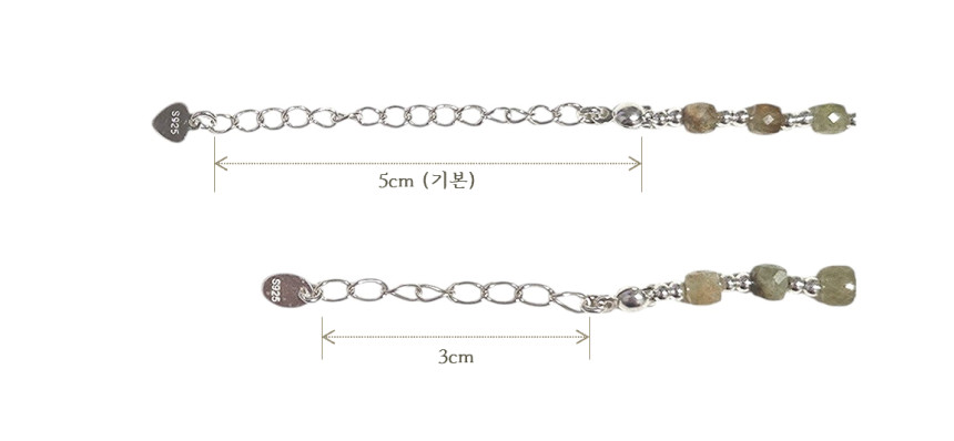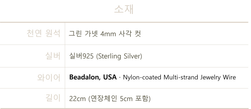 올리브 톤의 그린가넷과 실버 925가 만나 손목 위에 은은한 포인트를 더합니다.